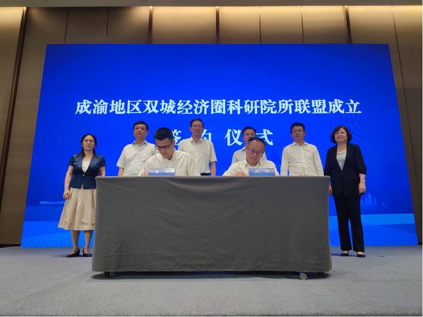 6月22日,有助于成渝地区双城经济圈科技协同创新专项工作组第四次会议在绵阳举行。会上,重庆市科研院所协会、四川省科研单位院所长协会分别代表川渝科研院所进行签约,联合发起创建成渝地区双城经济圈科研院所联盟,四川省科技厅厅长吴群刚、重庆市科技局局长明炬等领导见证签约。